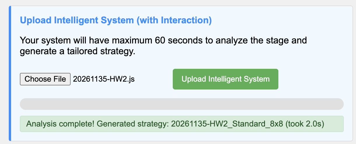 - Note: It is acceptable to submit just the strategy without a fully built intelligent system. Keep in mind that even an optimized fixed strategy might not achieve 100% success on unknown stages.